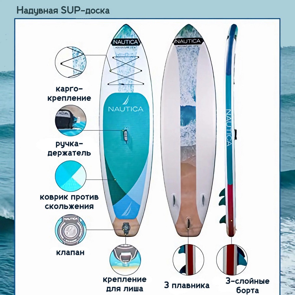 Форма доски позволяет использовать сап на реках, озерах, морях, на ней так же можно заниматься йогой. Имеет отличную устойчивость, подходящая даже новичкам. Надувная доска Nautica 10.6